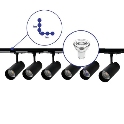 Complete Set 1-Phase Rail L 1 x 1 Meter Black | incl. 6x Spot + GU10 2700K 3W Dimmable + End Cap, Power Connector and L -Connector