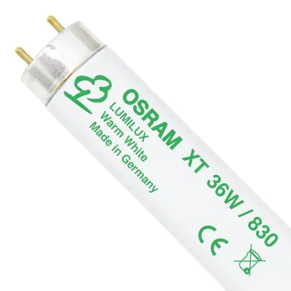 The Osram T8 L 36W/830 XT G13 Warm White are 120cm long flourishing tubes endowed with a G13 socket. The power output of these tubes is worth 36W. These tubes are categorized within the energy efficiency class 'A'. Their colour rendering is set between 80Ra and 89Ra.The peculiar characteristic of these lamps consists in their exceptionally long life span of 50.000 hours. These tubes produce a warm white light corresponding to a colour temperature of 3000K.