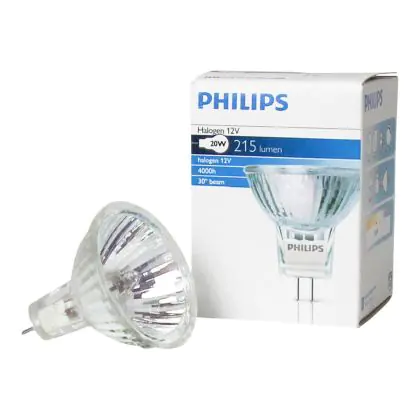 Philips Brilliantline Dichroic are halogen lamps with reflectors. These lamps are composed of a neon filled halogen burner, and of an axial filament in a glass reflector.